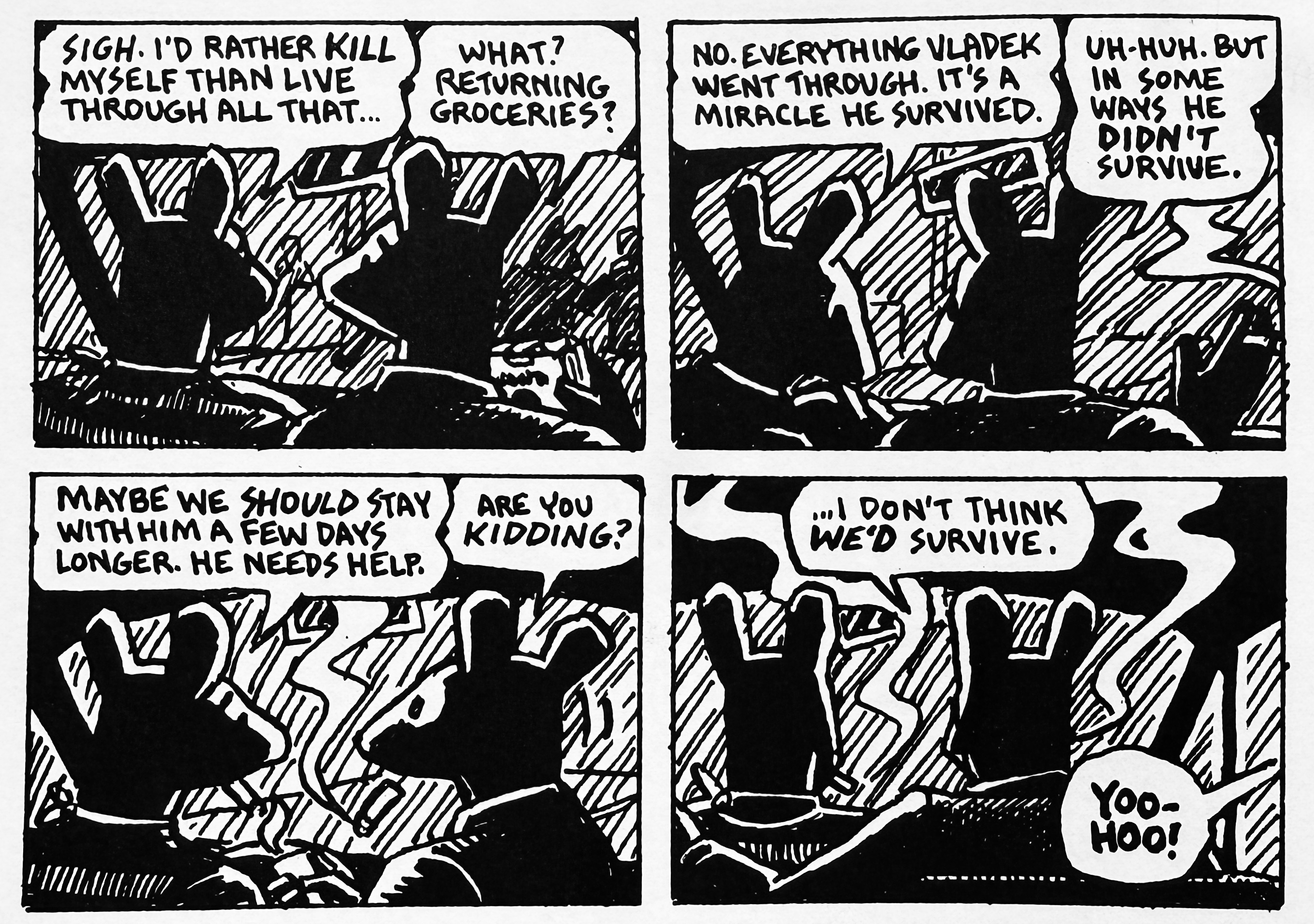 Vladek heeft veel meegemaakt. Zijn verhaal is indrukwekkend, zoals er duizenden indrukwekkende verhalen zijn te vertellen over mensen die de Holocaust hebben doorgemaakt. Maar Spiegelman heeft er goed aan gedaan om van Maus niet alleen een familievertelling te maken die zich in het verleden afspeelt. Door het verder te trekken naar het heden, wordt pas echt duidelijk hoe de oorlog mensen blijvend verandert. En hoe ook de generaties daarna ermee opgezadeld zijn.
