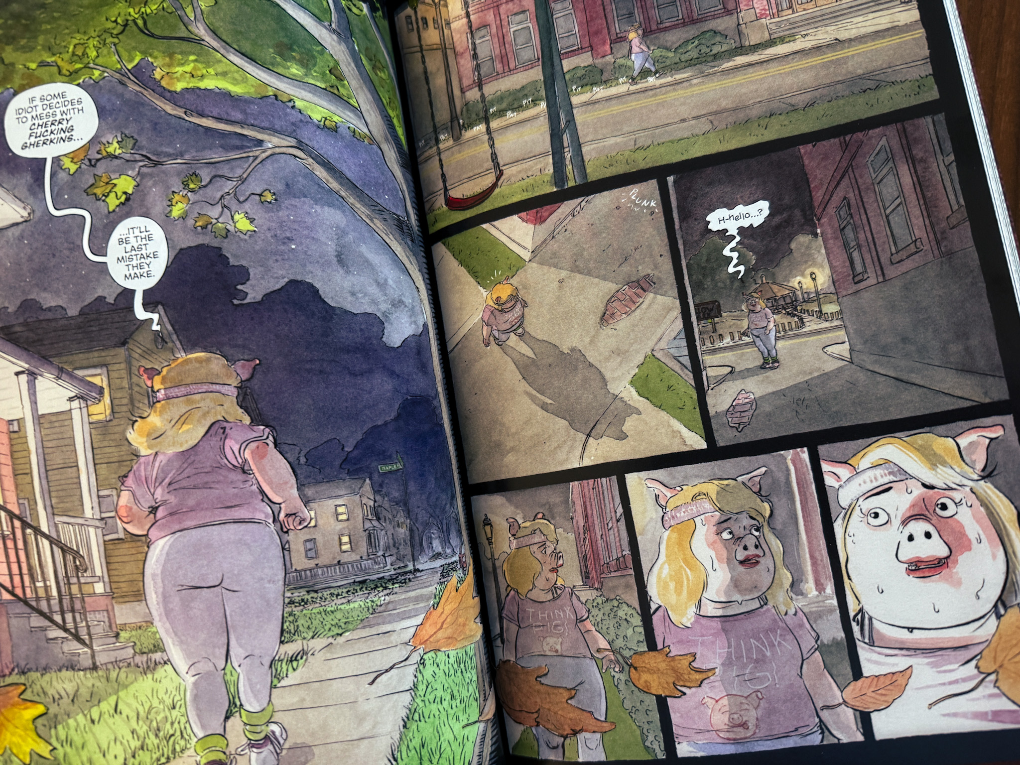Het zijn de uitersten die dit concept zo uniek maken en zo goed laten werken. Enerzijds die gezellige dieren in waterverf, anderzijds de horror van de moorden. Dat dit de eerste échte strip is van Patrick Horvath, is bizar. Hoe hij sfeerbeelden tekent — en hoe hij daarmee lucht geeft aan het doordenderende verhaal — is uitmuntend.