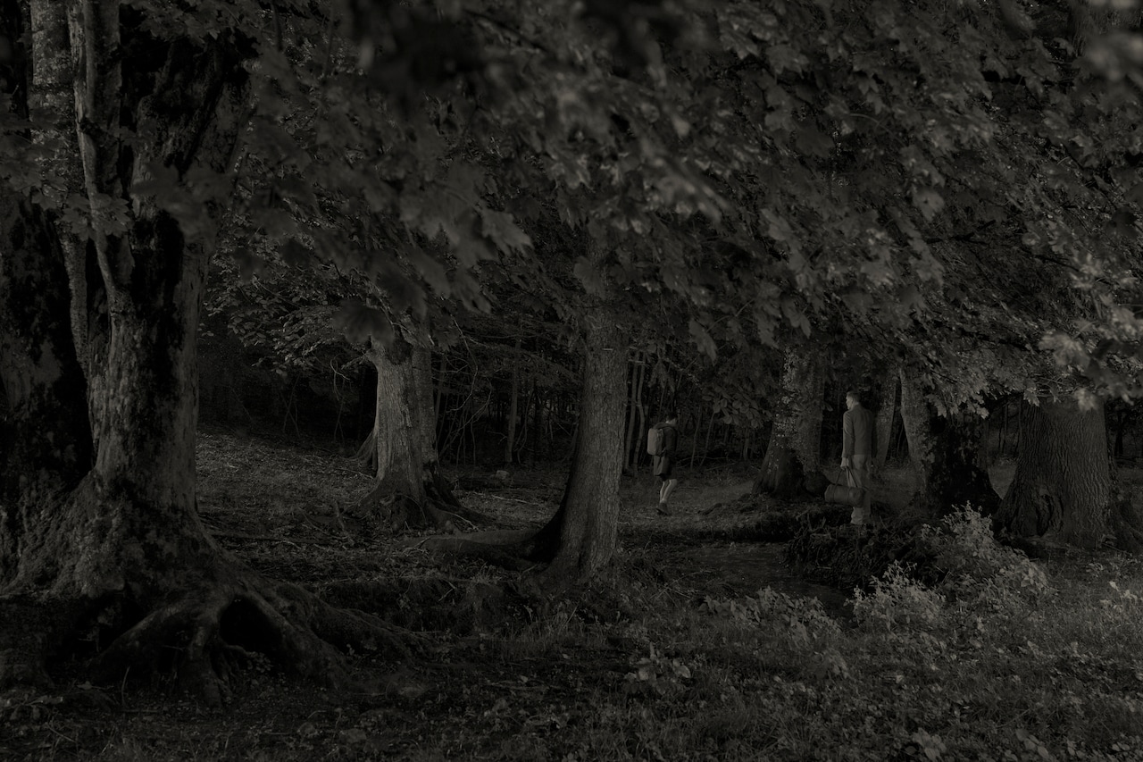 Nog zo’n prachtige serie: Im Wald. Het zijn foto’s in somber zwart wit, op overweldigende formaten afgedrukt voor het Stedelijk Museum. Het portret met zijn partner Kevin ontroert meteen als je er voor staat. We zien de twee als kleine poppetjes in een donker bos staan, allebei vanaf hun rug gezien. Erwin staat met een tas in de hand, hij kijkt naar hoe Kevin met een rugtas bij hem wegloopt.