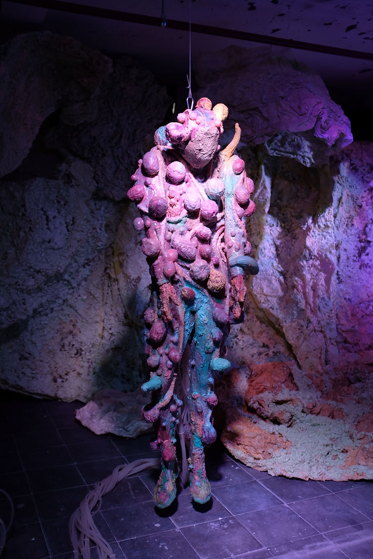 Bijvoorbeeld deze vervreemdende installatie van kunstenaar Mette Sterre. Dit pak is geloof ik onderdeel van het project Seapussy Power Galore, Abcession (If you don’t know, you don’t grow). Ik verzin het ook niet. Dit bultenpak kan gedragen worden, al werd hij in Eindhoven levenloos tentoongesteld. En dat maakte al indruk. Het lijkt zo uit de zee gekropen in een game als Baldur’s Gate 3. De dikke, navelstrengachtige kabels doen denken aan bodyhorror van regisseur David Cronenberg.