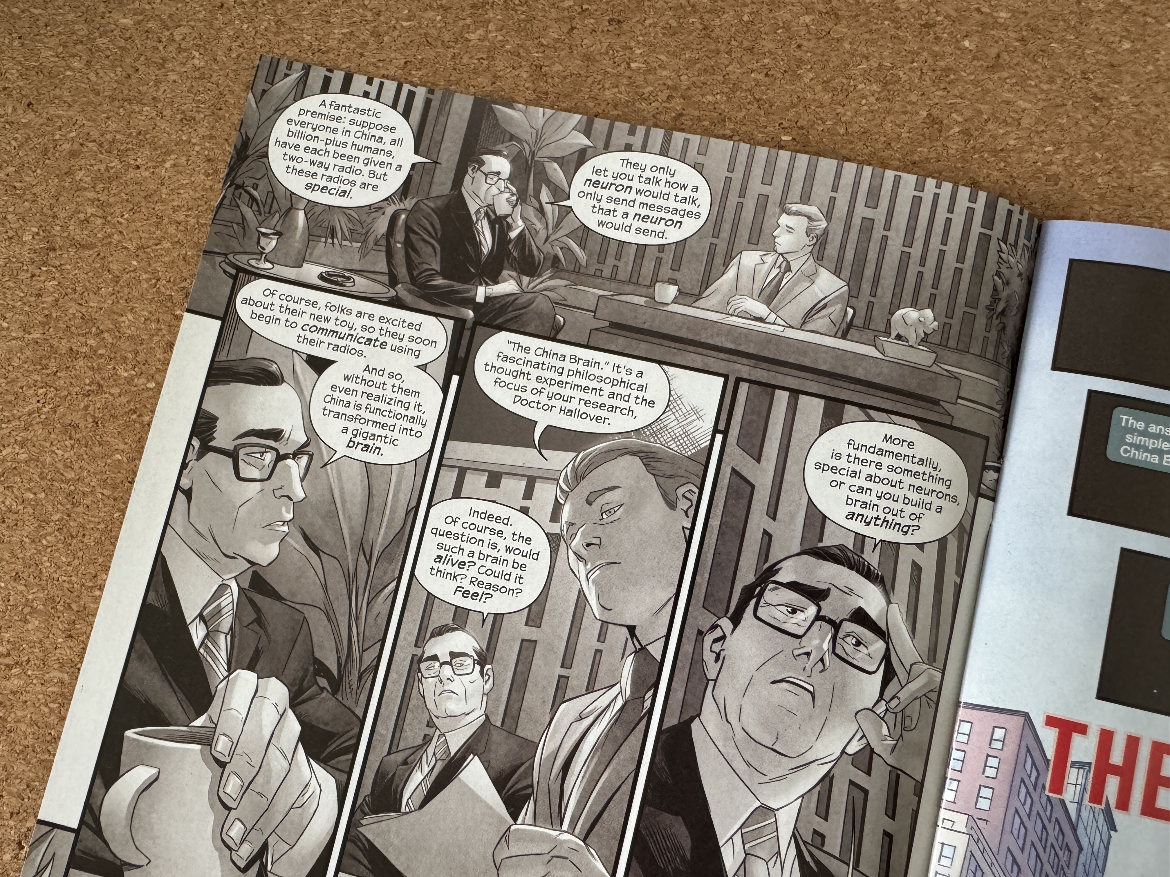 Deel 15 van Fantastic Four is gebaseerd op een gedachte-experiment dat uit de jaren zestig stamt: het China-brein. Wat zou er gebeuren als elke Chinese inwoner één neuron uit een brein simuleert? Zouden zij samen uiteindelijk een werkend brein vormen dat als geheel kan denken, redeneren en voelen?