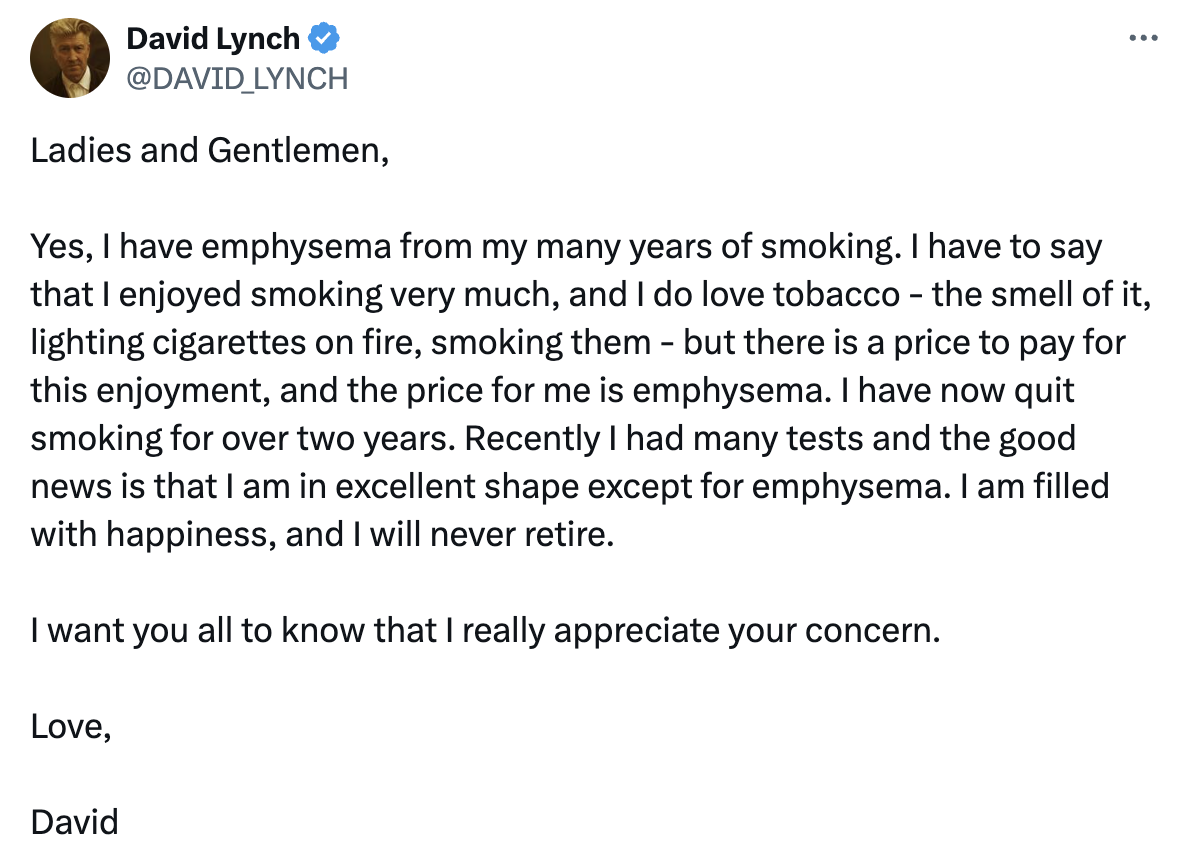 Lynch heeft zijn geliefde sigaretten inmiddels twee jaar opgegeven en hij zegt, afgezien van longemfyseem, in een blakende gezondheid te verkeren. Ook zijn producer Sabrina Sutherland mengde zich in het gesprek. “Longemfyseem heeft hem niet echt afgeremd”, zegt ze. “Hij is alleen voorzichtig en gestopt met roken. Hij kan nog prima regisseren en wellicht doet hij dat in de toekomst ook.” Er lopen wat gesprekken, zegt ze.